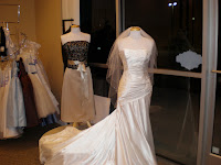#2: One of my best friends Michelle and I went to lunch sometime last week and as we were leaving we drove by this bridal store. This wedding dress and bridesmaid dress was in the window. We HAD to stop. They're gorgeous! The wedding dress (which wasn't actually my focal point, surprisingly) was a little under $1,000. But the Bridesmaid dress, which I love, were like $150 or something. I love the bridesmaid dresses.. when the time is right I want to take this pic and run with it. See what colors they have, sizes, etc. I'm more excited to find those dresses than I am my own! :)